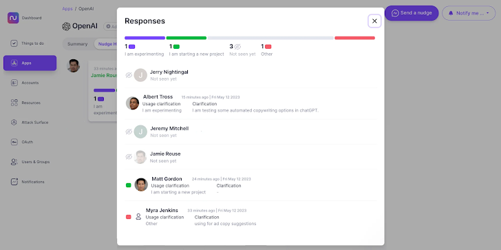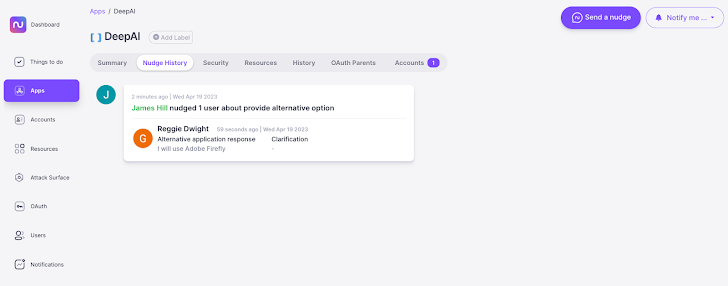 Nudge Security ontdekt alle generatieve AI-accounts die ooit door een medewerker zijn aangemaakt en waarschuwt u als er nieuwe AI-apps worden geïntroduceerd, zodat u inzicht krijgt in wie wat gebruikt en medewerkers naar best practices kunt leiden om de AI-beveiligingsrisico’s te beperken.